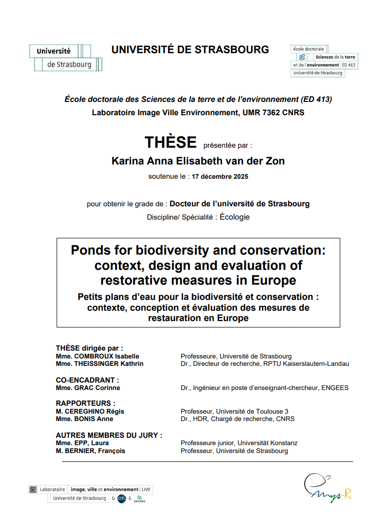 La thèse « Petits plans d’eau pour la biodiversité et la conservation : contexte, conception et évaluation des mesures de restauration en Europe » (traduit de l’anglais) de Karina Van Der Zon de l’Université de Strasbourg s’inscrit dans un contexte de déclin marqué de la biodiversité des écosystèmes d’eau douce, lié à la dégradation et à la perte des habitats.