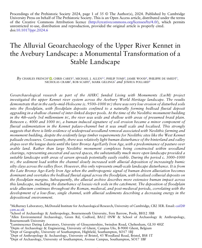 Des recherches géoarchéologiques menées dans le cadre du projet AHRC Living with Monuments ont étudié le bassin supérieur de la rivière Kennet, dans le paysage d’Avebury. Elles montrent qu’une érosion très lente des sols de la plaine alluviale s’est produite durant l’Holocène ancien et moyen (c. 9500–1000 BC), avec des dépôts sédimentaires limités dans un paléo-chenal reliant plusieurs bassins d’eau. À l’époque de la construction des monuments néolithiques (4e–3e millénaires BC), la rivière était large et peu profonde.